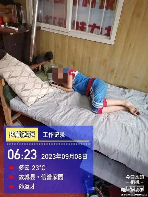 事情發(fā)生在2023年9月7日晚23點(diǎn)16分,恒威安保駐信譽(yù)家園執(zhí)勤班組在巡邏過程中,發(fā)現(xiàn)一名7歲的小孩獨(dú)自在小區(qū)內(nèi)行走,便上前詢問,得知孩子找不到回家的路也記不得家長的電話,巡邏隊(duì)員便把孩子帶到值班門崗,陪伴在孩子身旁,不停地安慰孩子,同時(shí)在小區(qū)業(yè)主群內(nèi)發(fā)布尋找孩子家屬的信息,一直到凌晨1點(diǎn)仍然沒聯(lián)系到孩子的家長,于是保安隊(duì)員將自己臨時(shí)休息的單人床讓給孩子休息,隊(duì)員們則輪流值班陪伴在他身旁。